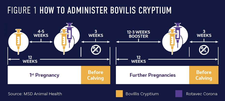 In the first season give 2 doses of Bovillis Cryptium, 4-5 weeks apart, in the 3rd trimester of pregnancy. To be completed at least 3 weeks before calving.