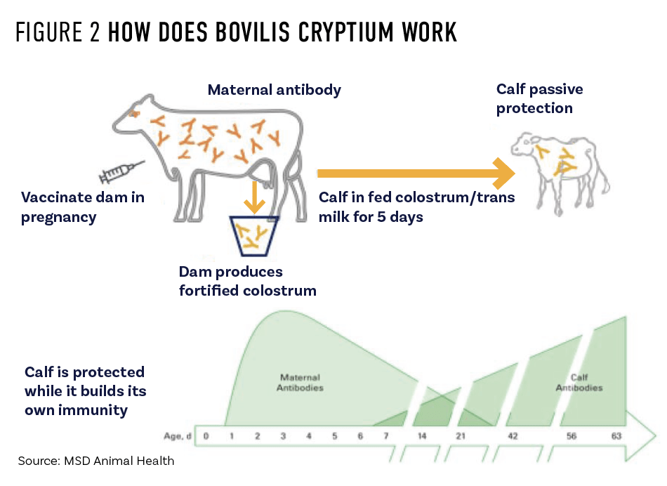 Bovilis Cryptium enables the dam’s immune system to produce antibodies against crypto. These antibodies are then transferred into her colostrum and transition milk. Correct colostrum management can ensure the calf receives these protective antibodies through passive transfer to the calf.
