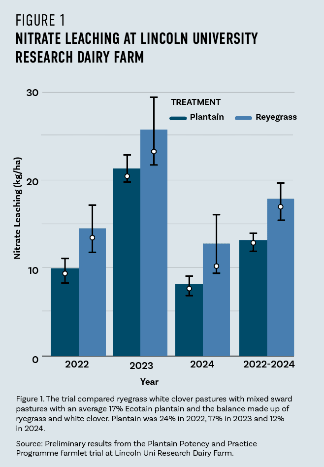 The Lincoln farmlet trial results indicate that levels as low as 12% can deliver substantial reductions in nitrate loss, making plantain an accessible mitigation tool.