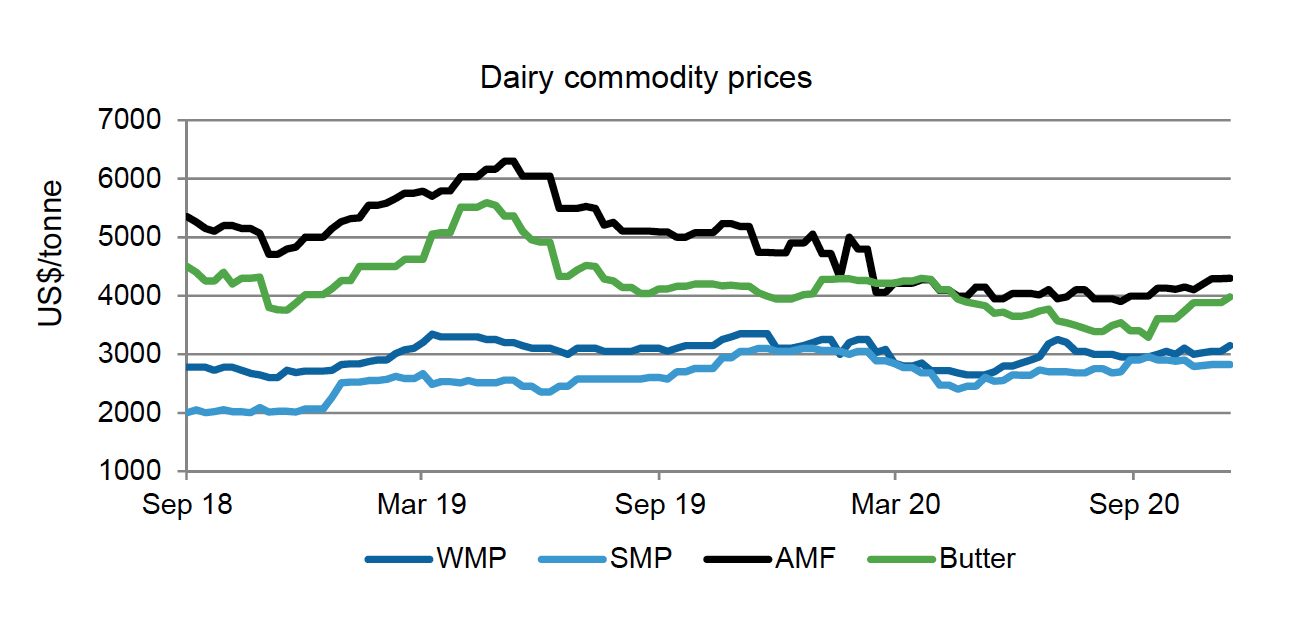 In early December, milk powder prices were roughly where they were pre-pandemic, but milk fat prices were still lower than they were in January/February. Milk fat prices are also under the five-year average – butter is under the five-year average by about US$500/t and anhydrous milkfat by roughly US$850/t. However, this does include the period of time when milk fat prices were very high. Prices of around US$4000/t for butter and just over US$4100/t for AMF are not exactly low prices for the commodities, particularly considering the global food service sector is still not operating at full capacity and consumer demand remains uncertain.