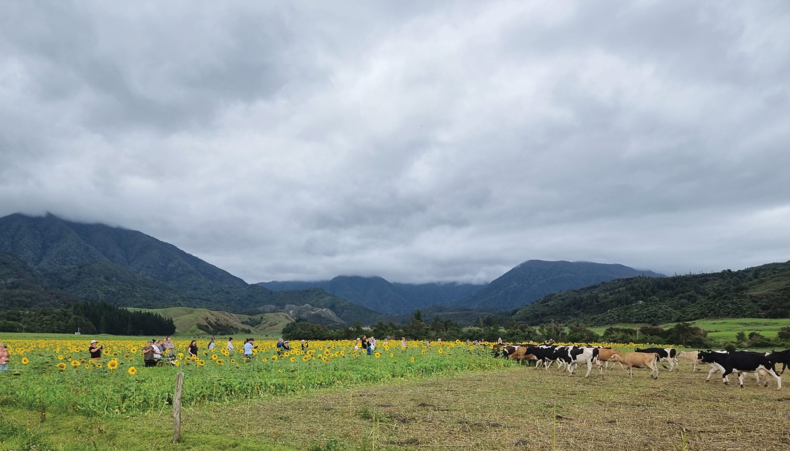When Wayne and Tyler Langford posted a photo on a Golden Bay community facebook page of the sunflowers blooming in their crop, 1,000 people liked the photo – nearly a third of the community’s population. When they posted an invite to the public to head to the farm for photos in the sunflowers and watch the cows head in for milking, more than 50 people turned up.