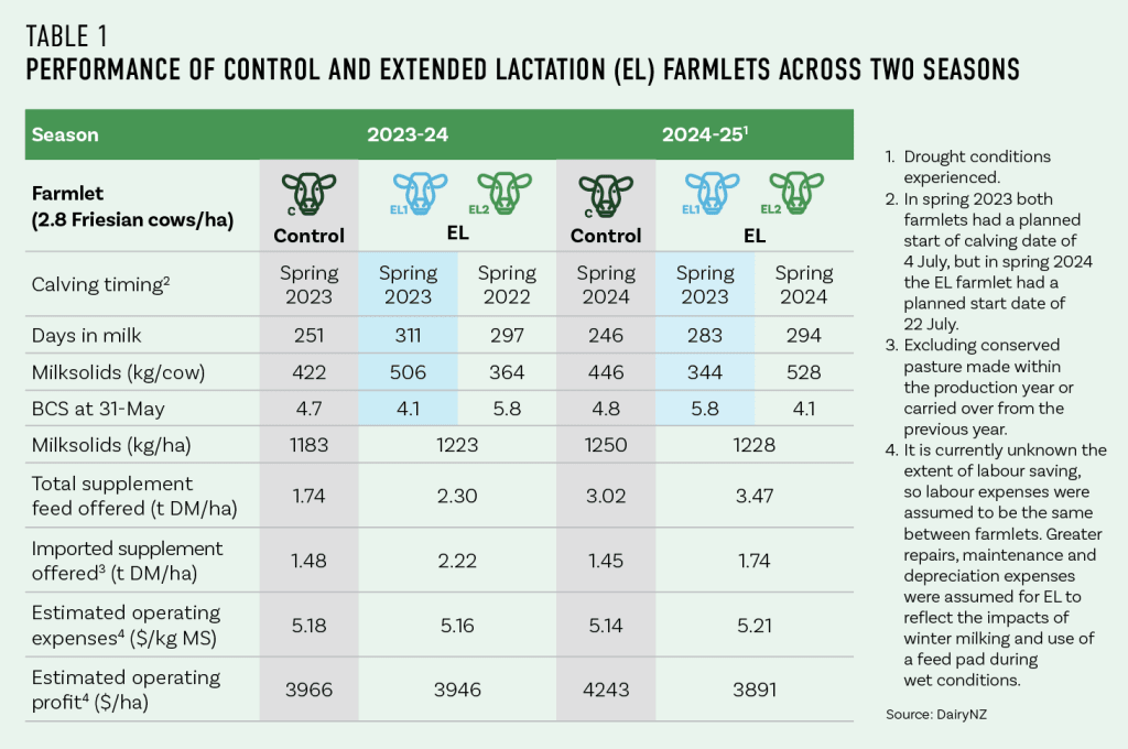 After two seasons, results show milksolids production, operating profit and sustainability were broadly similar between systems. But there were challenges. Keeping cows milking through winter required extra feed – about 180kg per cow in year one. In year two, researchers delayed calving and aimed to boost autumn pasture cover to reduce this need for supplement, but that reduced days in-milk and lowered profit. The trial has since returned to the same calving dates for both 12- and 24-month systems, with some extra winter feed now planned.
