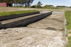 The solids sit in the concrete trough and build up for six months then the effluent is diverted to the other channel and the first one dries to a low drymatter through drainage and evaporation. Once a year the Le Prous pay a contractor $1600 to scrape out the dried solids and apply them to a maize paddock before cultivation.