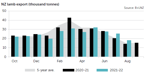 Slaughter graphs show a gaping hole in production through the early stages of 2022. It has only been since June that processors have been in a position to claw back some of the deficit. These swings in supply have resulted in tighter exports leaving NZ. Season to date, covering the first 10 months of the season, NZ has exported 259,000 tonnes of lamb. This compares with 280,000t over the same period last season.