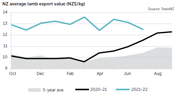 Average export values for lamb tend to peak in early spring, but last year that rally continued into the shoulders of the season. After bottoming at $9.61/kg in March 2021, average export values for New Zealand lamb climbed by a whopping $3.43/kg by December.