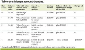The possibility farmers could be called on to deposit significant sums into margin accounts if milk prices lift above the price they’ve sold their futures contract at is something farmers must work through with their banks and financial advisers before they use the new hedging tool,
