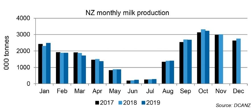 The Northern Hemisphere is at its low point for the year, in terms of milk supplies. Neither the European Union nor the United States are expected to see much growth for 2019 as a whole. For the EU this has mostly been a weather story – and growth is expected to improve as we head through the end of 2019 and into 2020.