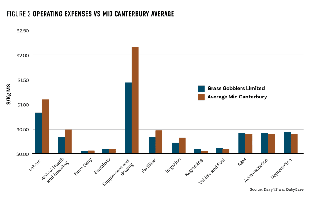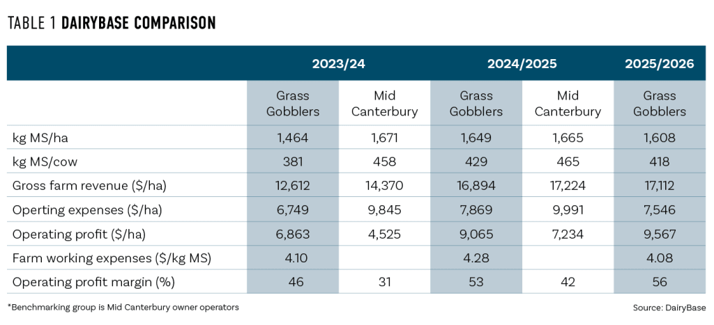 Comparing them with other Mid-Canterbury farms in DairyBase, where the average operating profit was $7234/ha last season, it’s apparent the main difference is significantly lower costs rather than a higher income. (see Table one)