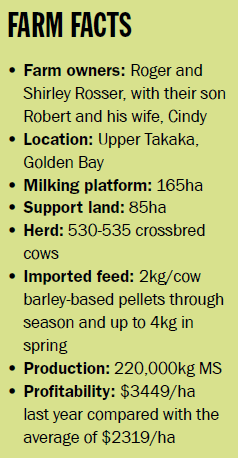 The business near the top of the Takaka Valley encompasses a 165ha milking platform and an adjoining 85ha support block where the cows winter for six weeks. Between 530 and 535 cows are milked through the season which is close to 3.1 stock units per hectare. The herd consistently produces about 220,000kg milksolids (MS) through efficient grass utilisation and also up to 380 tonnes of pellets fed in the dairy.