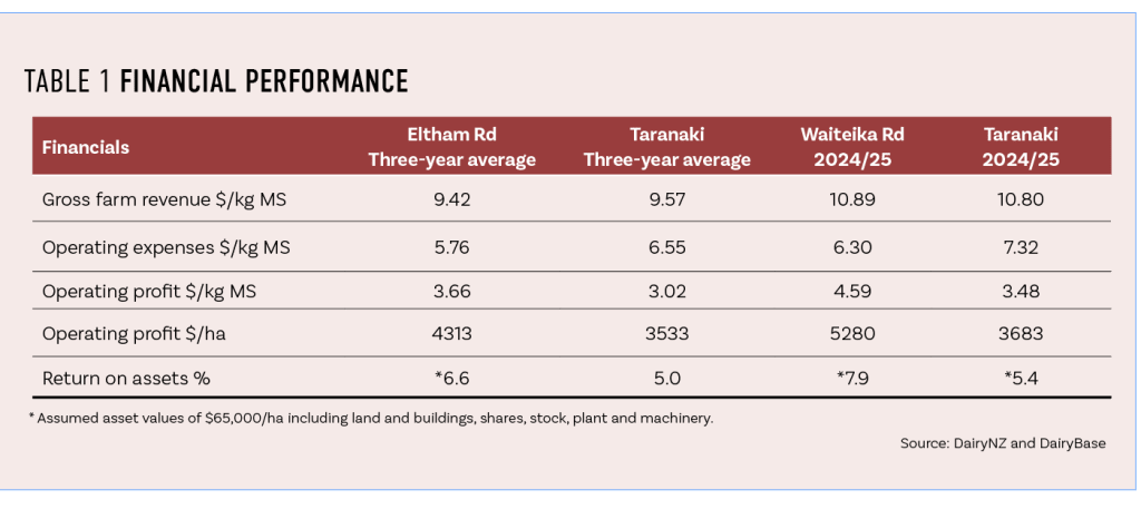 Operating profit is consistently above the Taranaki three-year average. DairyNZ analysis of their financials in Table 1, which combined contract milking and farm owner figures, shows that it’s not a higher gross farm revenue driving the performance but a lower cost structure, due largely to lower supplement costs.