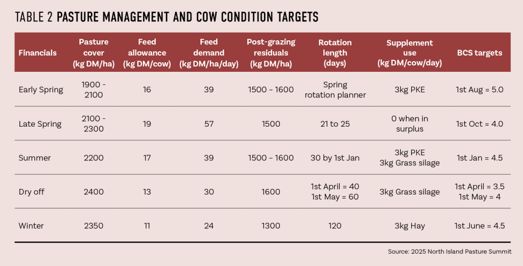 Round length is out to 40 days by April 1 and 60 days by May 1 with a 2400kg DM/ha cover targeted for June 1.
