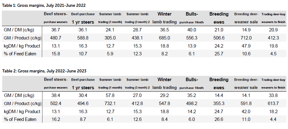 Most gross margins (gm), apart from trading weaner steers, show a moderate decline. Note: the standout gross margins are the one-month lamb trading which was an opportunity in December 2022, before warmer weather plus rain raised the store price. So too was the significant reduction in breeding ewe profitability. Also, the venison trading gross margin shows a significant increase due to the $9/kg CW achieved in spring 2022, compared to $8/kg CW 12 months earlier. This suggests that for some farms, those suited to livestock trading, dairy grazing and perhaps cropping, and with useful areas of deer fencing, the reduction in gross income may not be too severe.