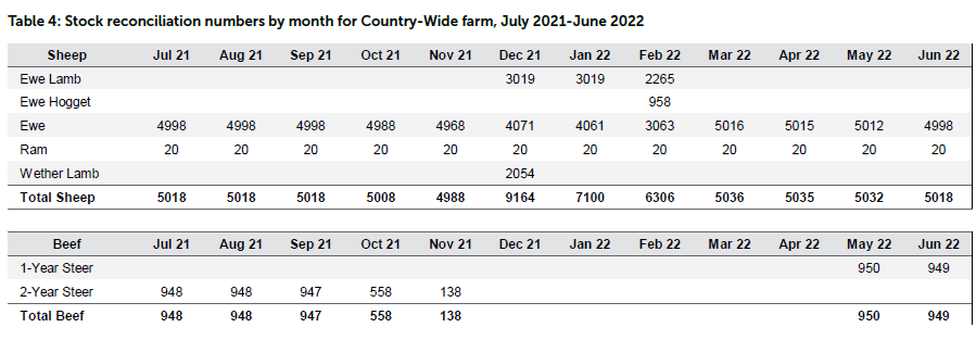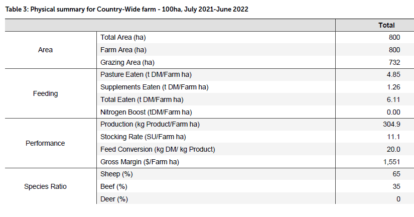 The two budgets (all tables are Farmax) are based on a 8800 stock unit farm called Country-Wide. Cropping is 50ha fodder beet and 96ha pasture silage. One thousand replacement ewe hoggets are grazed off for 12 months, and no nitrogen is applied. The large area of hill country limits trading options (trading yearling steers has a far superior gross margin than breeding ewes) and the fodder beet, subject to climatic risk as there is no irrigation, improves winter carrying capacity.