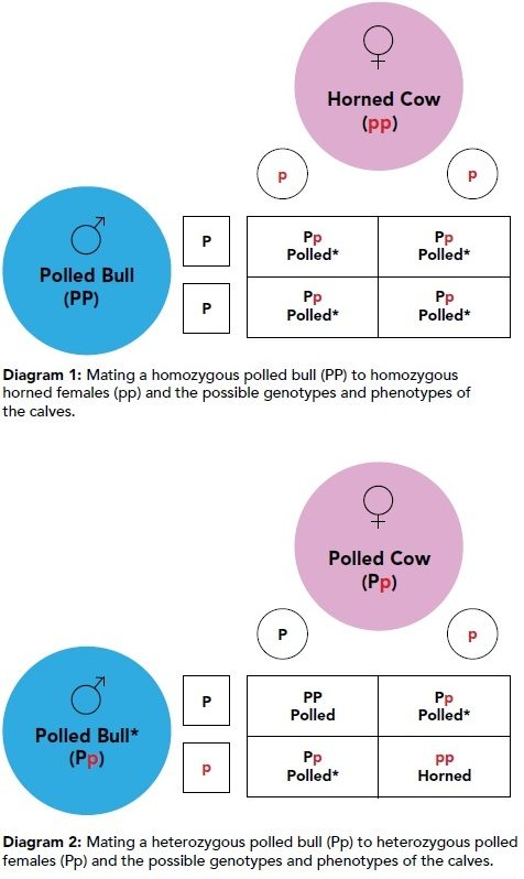 Homozygous (pure/PP) polled bulls dehorn every calf at conception as their PP genotype is dominant over a horned cow’s (pp) genotype. A heterozygous polled (Pp) bull is able to produce polled (Pp) or horned (pp) offspring if the cow is horned.
